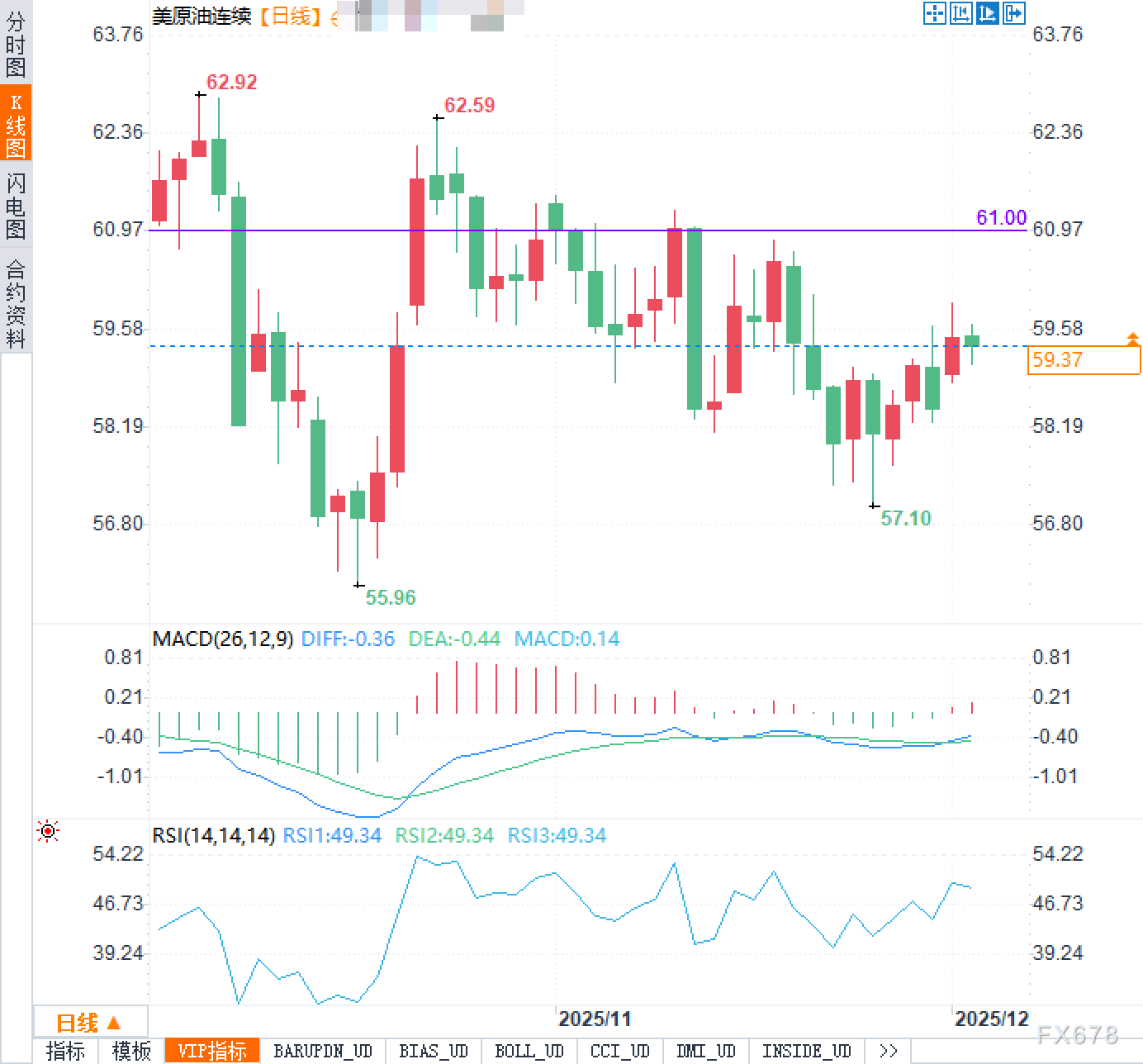 从美原油日线图来看,价格自触及55.96美元的阶段性低点后启动反弹,随后在11月下旬再度回探57.10美元形成双底雏形,目前已回升至59.40美元附近。上方61.00美元区域构成重要阻力带,若能有效突破,多头有望进一步挑战62.59美元乃至62.92美元的前高。下方59美元为短期关键支撑,一旦失守,价格可能重新回测57.10美元一线。整体而言,K线形态显示多空双方在59至61美元区间内激烈博弈,短期内突破方向尚不明朗。