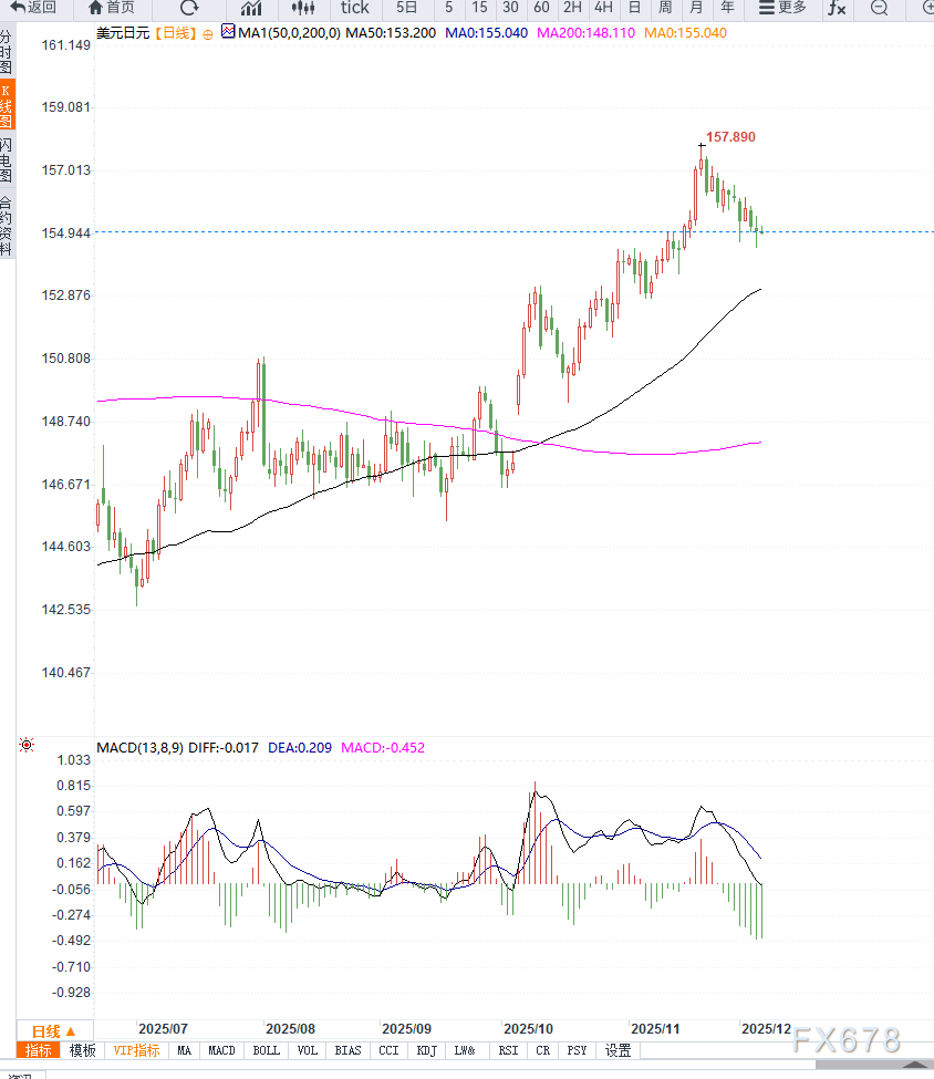 同时,跌破155心理位后,空头力量进一步增强。