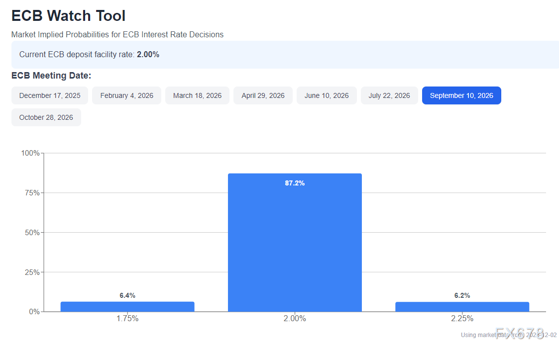 货币政策分化仍是当前欧元的核心支撑逻辑,这也意味着后续欧元回调空间大概率受限,欧洲利率观察显示明年10月降息概率依然不超过20%。