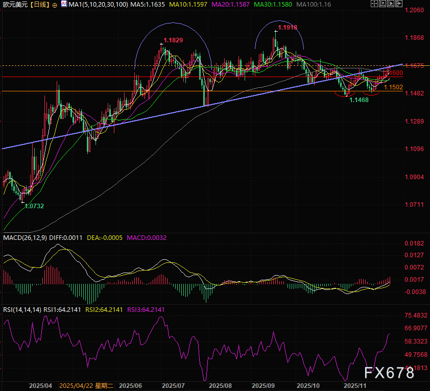 欧洲央行行长拉加德周三的讲话也进一步印证了这一立场,她强调家庭支出与韧性十足的劳动力市场为欧元区经济提供关键支撑,核心通胀保持平稳,暗示12月18日议息会议后仍将维持利率稳定。