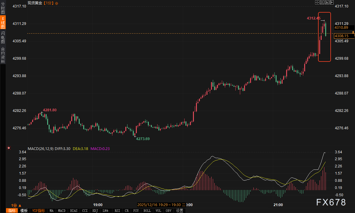 数据公布后,金融市场反应迅速且出现分化。现货黄金自数据公布前的4301美元/盎司附近快速拉升逾10美元,最高触及4312美元,随后持稳于4308美元一线;COMEX黄金期货主力合约同步走高至4339美元附近。美元指数则加速下行,从98.05附近跌至97.90下方。美国国债收益率普遍回落,10年期收益率下跌约2.7个基点至4.157%。利率期货市场显示,交易员对美联储明年1月降息的预期概率小幅上升,但对2026年整体的降息幅度预期仍维持在约两次、58个基点左右。
