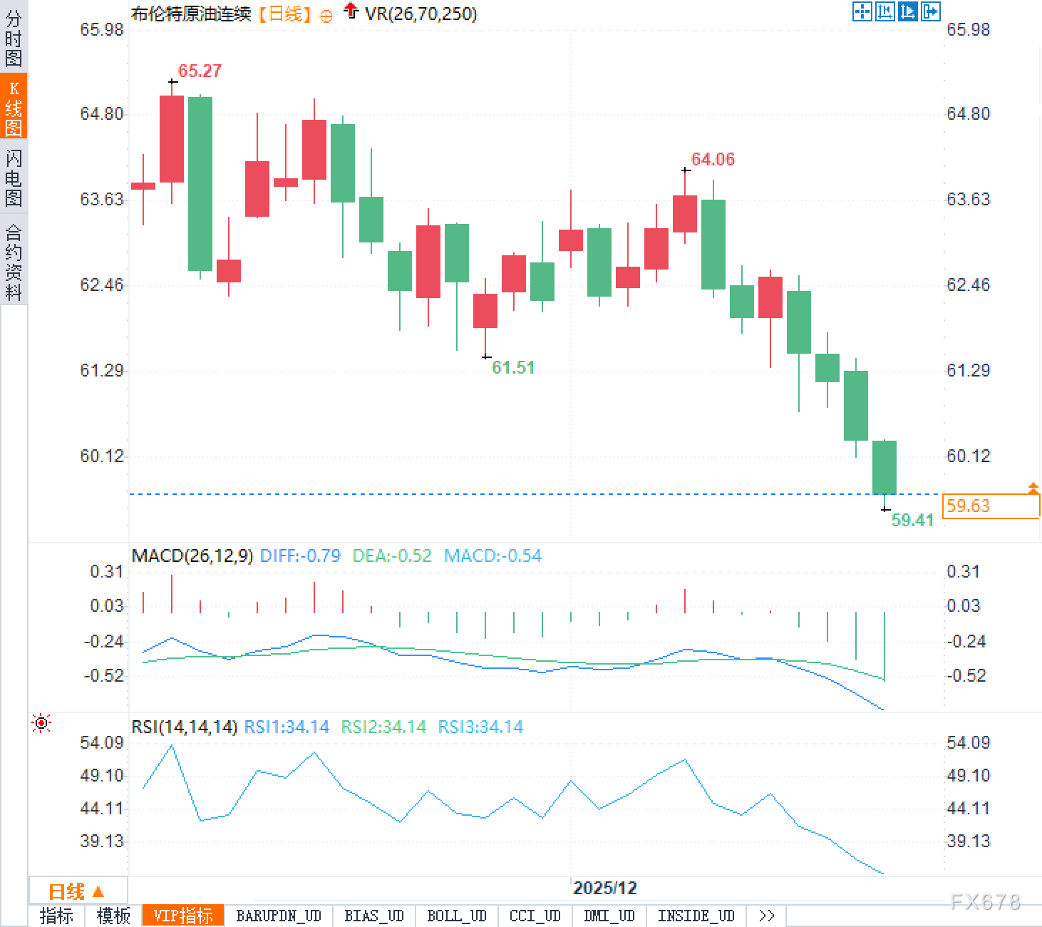 从日线K线图看,价格自前高65.27美元回落后,先在62.50美元至63.50美元一带反复拉锯,随后失守61.51美元这一前期低点,空头顺势把行情推进到60美元下方。最近数根阴线呈现“高点下移、低点下移”的下降趋势特征,趋势线压力明显;与此同时,59.41美元的下影触及后,当前回到59.63美元,说明60美元整数关口附近存在一定承接,但目前更像技术性喘息而非趋势反转。